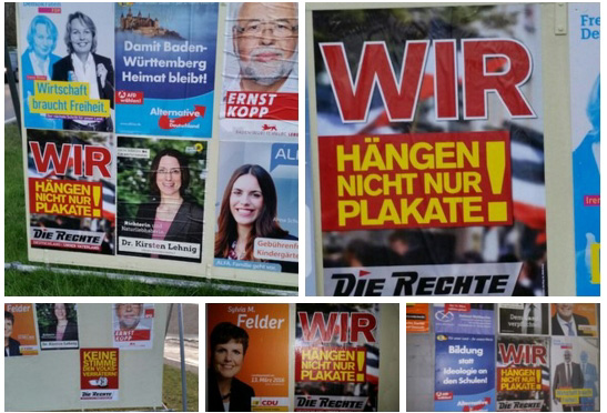 Ebenfalls in Sachsen-Anhalt verbreitet die Partei anlässlich der Landtagswahlen Plakate mit der Aufschrift „Wir hängen nicht nur Plakate“ – ein Affront, wenn man bedenkt, wo diese Plakate hängen: Etwa direkt vor einer Flüchtlingsunterkunft im Stadtteil Neu-Olvenstedt und auch in Straßen, in denen bekannte Aktivisti_innen gegen Rechtsextremismus wohnen. Dass die Partei damit erst jetzt Empörung erntet, ist allerdings eher der Aufmerksamkeitsökonomie des Internets geschuldet. Der „Die Rechte“-Kreisverband Hamm wirbt mit dem gleichen Spruch schon seit 2013 auf seiner Homepage. („Unser Versprechen für die kommenden Wahlkämpfe: Wir hängen nicht nur Plakate! …wir verteilen nämlich auch Flugzettel, machen Infostände und Demonstrationen.)“
