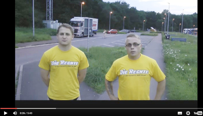Per Facebook verbreitete „Die Rechte“ Dortmund im Juli 2015 Fotos einer besonders perfiden Aktion im Bürgerwehrstil: Ihre Aktivist_innen patroullierten nachts als selbsternannter „Stadtschutz Dortmund“ mit einheitlich gelben „Die Rechte“-T-Shirts im Stadtteil Eving. Nach eigenen Angaben waren sie vor allem in der Nähe einer Flüchtlingsunterkunft aktiv und haben sich dabei Polizeiaufgaben zugemessen: „Neben dem Zeigen optischer Präsenz führten die Aktivisten auch Gefährdenansprachen bei potentiellen Kriminellen durch, die das Asylheim verließen und teilten diesen mit, dass sie im Visier stehen“ (Fehler im Original), heißt es in einem Bericht der Szene. „Die Rechte“ knüpfte mit der flüchtlingsfeindlichen Aktion an ähnliche Auftritte im Sommer 2014 in U-Bahnen und an vermeintlichen „Schwulentreffs“ an: „Wo die Staatsmacht versagt, sind wir Bürger gefragt!“