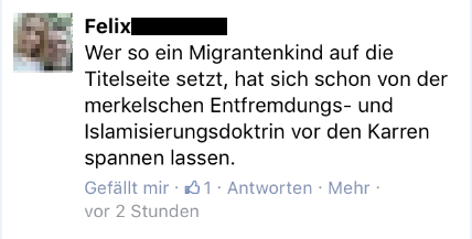 Fazit: Bei der Betrachtung der Kommentarspalte unter dem Artikel und auf Facebook scheint es, dass es für die Leser_innen der „Jungen Freiheit“ weniger um einen Austausch geht als um Anerkennung für die Legitimität ihrer Positionen und eine Diskursverschiebung. Feindbilder bleiben dabei aktiv. So wird ein „versöhnliches“ Interview trotzdem als Übernahme und Infiltrierung gedeutet. Die Diskussionsverweigerung , die rassistischen Äußerungen und Beleidigungen aussenden, spricht für sich.