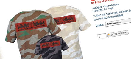 Thor Steinar hat ebenfalls einige Kleidungsstücke mit Tarnfarben im Programm. Aber bei näherer Betrachtung sieht das Tarnmuster der Thor Steinar-Klamotten irgendwie anders aus. Weder bei der US-amerikanischen Armee noch bei der Bundeswehr findet man ähnliche Muster. Eine kurze Nachfrage beim Deutschen Historischen Museum bringt die Antwort: „Es handelt sich eindeutig um den Wunsch das Splittertarnmuster der Wehrmacht nachzuempfinden, nur die Größenverhältnisse stimmen nicht ganz“, bestätigt uns Museums-Historiker Dr. Sven Lütken.