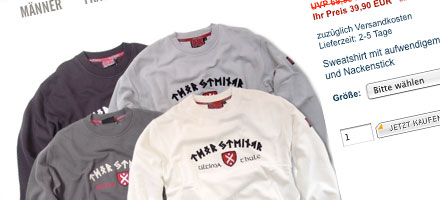 Der Kapuzenpullover „No Inquisition“ von Thor Steinar zeigt einen Adler, der einen Fisch, der als Symbol für das Christentum gilt, aus dem Wasser greift. Offensichtlich um ihn zu verspeisen. Ein T-Shirt gegen Christen? Na gut, Thor Steinar benutzt bekanntlich viele Motive aus der nordischen Mythologie und da die Wikinger Christen nicht ausstehen konnten macht das natürlich Sinn.