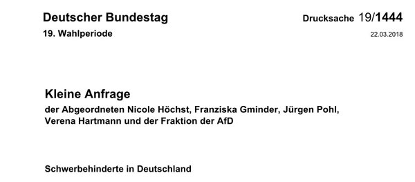 Am 22. März stellte die AfD im Bundestag eine kleine Anfrage, die in aller Deutlichkeit zeigt, welch Geistes Kind die AfD ist: Die Abgeordneten Nicole Höchst, Franziska Gminder, Jürgen Pohl, Verena Hartmann sowie die gesamte AfD-Bundestagsfraktion unter Leitung Alice Weidels und Alexander Gaulands möchten von der Bundesregierung wissen, wie viele Menschen in Deutschland als schwerbehindert gelten, um dann Mutmaßungen über die Auswirkungen „inzestuöser Verhältnisse“ innerhalb Migranten-Familien anzustellen.