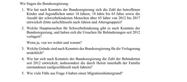Die Anfrage bezieht sich auf eine Zunahme von Menschen mit Schwerbehindertenausweis in der Bundesrepublik um 0,9 Prozent von 2012 bis zum Jahr 2015. Die Zahlen stammen vom Statistischen Bundesamt. Die Fragen der AfD suggerieren dabei, dass die Zunahme an Menschen mit Behinderung an den Geflüchteten liege, die angeblich Ehen innerhalb der Familien eingingen, was wiederum zu „Inzest“ und Behinderungen führe.