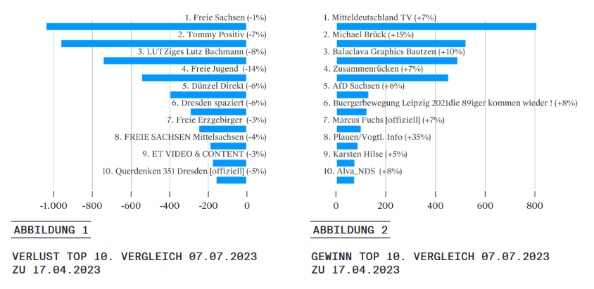 Verschiebungen auf der Akteursebene lassen sich anhand der Zahl der Abonnements ablesen. Bei den Verlusten setzt sich die in unserer letzten Ausgabe beschriebene Entwicklung fort. Auch jetzt noch betreiben die Freien Sachsen den wichtigsten sächsischen Kanal, aber ihre Bedeutung scheint zu schwinden. In diesem Beobachtungszeitraum stehen sie auf dem ersten Platz bei den absoluten Verlusten. Wenn dabei auch nur ein relativer Verlust von 1 Prozent zu Buche steht, macht dies bei über 150.000 Abonnements doch über 1.000 verlorene Profile aus. Fraglich bleibt auch weiterhin, ob sich die Zahl 150.000 ausschließlich aus realen Abonnements zusammensetzt. Die Viewzahlen sind, wie berichtet, jedenfalls zurückgegangen. Mit der nahestehenden Jugendorganisation Freie Jugend Sachsen, den Freien Erzgebirgern und dem Ableger in Mittelsachsen haben wir wie auch schon in der vorherigen Ausgabe drei weitere Kanäle aus dem Umfeld der Freien Sachsen unter den Top 10 der Verluste.