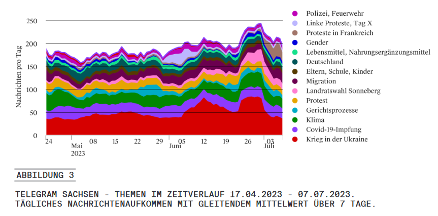 Durchgehend sind dem Thema „Krieg in der Ukraine“ die meisten Nachrichten – ein genauso breites wie wirres Gemisch an Verschwörungserzählungen und prorussischer Propaganda – zuzuordnen, gefolgt von den Themen „Covid-19-Impfung“ und „Klima. Es fällt auf, dass das Thema „Krieg in der Ukraine“ zweimal einen deutlichen Anstieg (u.a. wegen des Wagner-Aufstandes) in der Aufmerksamkeit erlangt, die Diskussionen auf Telegram folgen hier offenbar der gesamtöffentlichen Berichterstattung und dem Kriegsgeschehen. Gerade beim Thema „Covid-19-Impfung“ ist die Telegram-Debatte jedoch deutlich losgelöst von einer realen Entwicklung oder der gesamtgesellschaftlichen Diskussion; Nachrichten dazu werden relativ gleichbleibend häufig geteilt. Weitere Themen wie „Migration“, „Landratswahl Sonneberg“, „Protest“ (siehe Nissen 2023), „Linke Proteste, Tag X“ und „Gerichtsprozesse“ lassen sich zwar ebenfalls im gesamten Zeitraum nachweisen, unterliegen aber stärkeren Schwankungen. Zuletzt sind zum Beispiel Nachrichten zu „Protesten“ zurückgegangen, die Landratswahl war dann vor allem um den Wahltermin herum ein größeres Thema.
