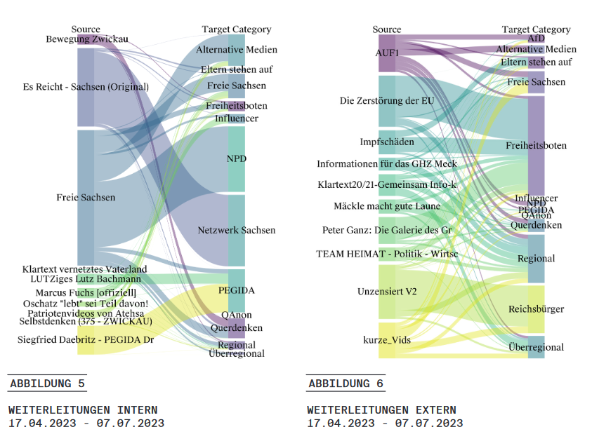Bei der aktuellen Betrachtung der Weiterleitung innerhalb unseres Samples („intern“) zeigt sich die weiterhin wichtige Rolle des Kanals „Es Reicht – Sachsen“, welchen wir im vergangenen Digital Report vorgestellt haben. Die Freien Sachsen bleiben weiterhin dominant, wenn auch überwiegend im eigenen Lager: Schon in den letzten Digital Reports fiel auf, dass die Freien Sachsen verhältnismäßig wenig in den regionalen und überregionalen Gruppen und Kanälen geteilt werden.
