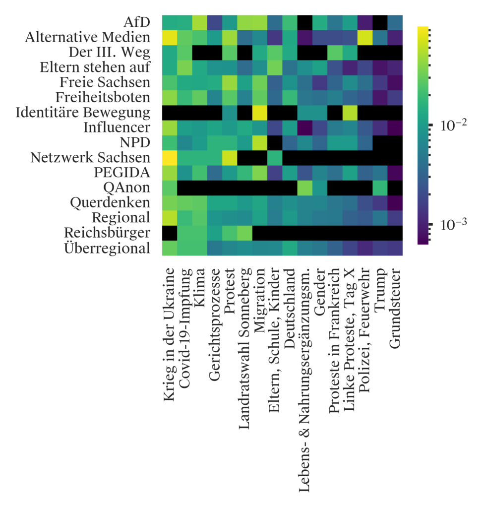 In Abbildung 4 sind in einer Heatmap von links nach rechts in absteigender Häufigkeit nochmals die wichtigsten in unserem Sample diskutierten Themen angeordnet. Je heller bzw. gelber die Färbung der Felder auf Höhe einer Akteurskategorie sind, desto häufiger kommt ein Thema vor. Es zeigt sich deutlich, dass die Themen nicht gleichmäßig über die von uns gebildeten Kategorien verteilt sind. So äußern sich die Kanäle und Gruppen der Identitären Bewegung und der Reichsbürger nicht zum „Krieg in der Ukraine“. Wie auch die Telegram-Präsenzen von Netzwerk Sachsen, QAnon und Der III. Weg behandeln sie eher ausgewählte Themenspektren. Bei den Reichsbürgern sind das „Covid-19 Impfung“, „Klima“, „Proteste“, „Gerichtsprozesse“ und die „Landtagswahl Sonneberg“, die Identitäre Bewegung konzentriert sich auf das Thema „Migration“ und in der QAnon-Subszene sind es der Krieg in der Ukraine“, „Lebens- & Nahrungsergänzungsmittel“, „Gender“ und „Trump“. Demgegenüber diskutieren die anderen Akteure sowie regionale und überregionale Kanäle und Gruppen, die sich nicht eindeutig einer bestimmten Strömung zuordnen lassen, eine breite Themenpalette.