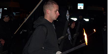 Ein ähnliche Bild herrschte bereits am Abend zuvor, als das „Aktionsbündnis gegen das Vergessen“ zum „Trauermarsch“ lud. Die Veranstaltung der „Freien Kräfte“ und Kameradschaften konnte rund 1000 Neonazis mobilisieren und setzte noch mehr auf mystische Primboriumssymbolik. Nazi-Mädchen trugen einen Trauerkranz, dahinter „Kameraden“ in Skelett-Kostümen mit Kreuzen in den Händen. Nur die Fackeln sahen etwas dürftig aus, dreißig durften die Rechtsextremen auf tausend Teilnehmende mitnehmen, Thomas „Steiner“ Wulff verteilt sie eifrig, Christian Worch läuft mit einer am Ende der Kundgebung. In den menschenleeren Straßen konnten die Rechtsextremen völlig unkommentiert Kreisaufstellungen vornehmen, kreischend agitieren und zur Schweigeminute auffordern – hier war die Straße wirklich ihr Gebiet.