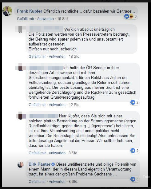 Vielleicht wird dort auch über die Aussagen von CDU-Fraktionschef Frank Kupfer gesprochen. Der kommentierte auf Facebook unter dem Beitrag von „Frontal 21“ zum Vorfall dergestalt, dass seine nicht sehr hohe Meinung vom öffentlich-rechtlichen Fernsehen offenbar wird (vgl. SZ).