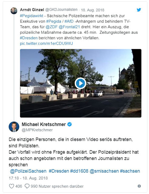 #Pegidawirkt – Sächsische Polizeibeamte machen sich zur Exekutive von #Pegida / #AfD -Anhängern und behindern TV-Team, das für @ZDF @Frontal21 dreht. Hier ein Auszug, die polizeiliche Maßnahme dauerte ca. 45 min. Zeitungskollegen aus #Dresden berichten von ähnlichen Vorfällen. pic.twitter.com/m1erCDU9WJ