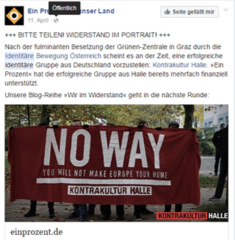 Nach eigenen Angaben sammelte „Ein Prozent“ mit einem Spendenaufruf auf ihrer Seite 10.000 Euro um die“ Identitäre Bewegung Österreich“ zu unterstützen. Mit den 10.000 Euro sollten Schäden, die bei einer „Grenzdemonstration“ der „IBÖ“ entstanden waren, beglichen werden.