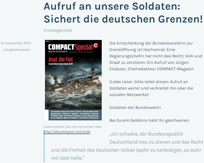 Elsässer fordert die deutschen Uniformierten im “Aufruf an unsere Soldaten: Sichert die deutschen Grenzen!” dazu auf, sich gegen die Befehlshabenden zu wenden und “selbst aktiv” zu werden. Die Grenzöffnung im Sommer 2015 für Geflüchtete kommt für Elsässer einem “Hochverrat” gleich und der “Notstand” sei nun eingetreten. Daher hätten die Soldat_innen nun das Recht, eigenständig zu den Waffen zu greifen, um Deutschland vor dem “Zustrom von Millionen Fremder” zu verteidigen.