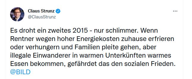Bisher ist zwar niemand zu Hause erfroren und wie gemütlich die Unterkünfte (Container? Turnhallen?) von Geflüchteten sind, sei vielleicht auch dahingestellt – aber ein solcher Beitrag klickt. Taktisch geschickt, aber strategisch quasi bedeutungslos ist hier von „illegalen Einwanderern“ die Rede – und das betont Strunz auch immer wieder im Bild-TV-Video, das mit dem Zitat geteilt wird: Es ginge ihm ja um Menschen, die illegal nach Deutschland kämen. Allerdings werden in diesem Video später auch Geflüchtete aus Afghanistan als illegal bezeichnet, oder ukrainische Geflüchtete, die aber vielleicht gar keine ukrainischen Geflüchteten wären, sondern nur einen ukrainischen Pass hätten.
