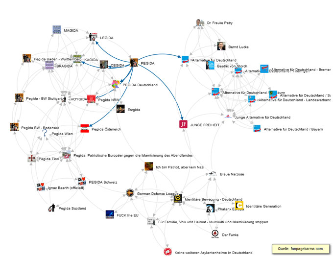 Der steile Aufstieg der Pegida auf Facebook (der noch einmal zu trennen ist von dem lokalen Erfolg auf der Straße) ist in gravierendem Maße auf die Netzwerkeffekte und Viralität des rechtsextremen und rechtspopulistischen Spektrums im Facebook-Kosmos zurückzuführen. Diese war der Grundstein dafür, dass die Bekanntheit der Seite Stück für Stück bis in die Mitte der Gesellschaft getragen werden konnte. Zum jetzigen Stand (Anfang Februar 2015) hat die Pegida Hauptseite bereits deutlich über 150.000 Likes. Eine solch steile Entwicklung ist ein enormer Erfolg für die Bewegung und ist selbst im Social Media Kontext recht ungewöhnlich (zum Vergleich bewegt sich etwa die Bundesparteiseite der SPD bei nur etwas über 80.000 Likes – die CDU bei ca. 90.000 Likes).