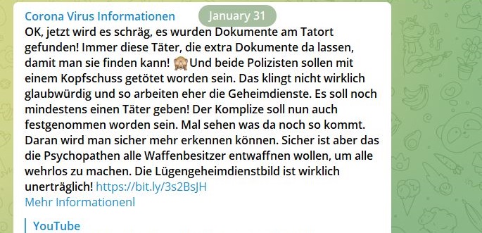 Die Morde bieten den in Coronaleugner:innen-Gruppen Organisierten aber auch Anlass, Verschwörungsnarrative zu verbreiten und zu verstärken.