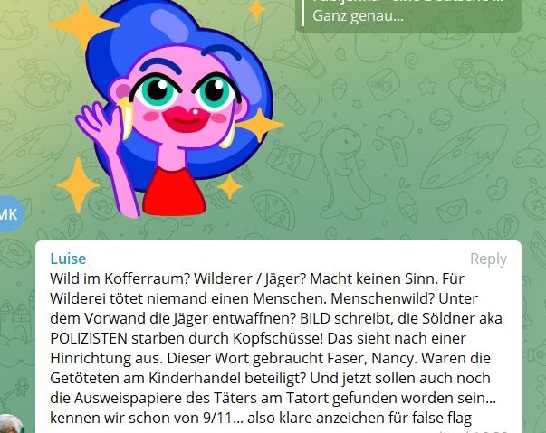 „Luise“ hat eine andere Idee: „Wild im Kofferraum? Wilderer/Jäger? Macht keinen Sinn. Für Wilderei tötet niemand einen Menschen. Menschenwild? (…) Waren die getöteten am Kinderhandel beteiligt?“ Dies bezieht sich auf die Verschwörungsideologien von QAnon, in denen es unter anderem auch im Kinder geht, die gehandelt und in Kellner gehalten und misshandelt werden. Sie nennt die Ermordeten „Söldner“, wie große Teile der Corona-Demo-Szene Polizist:innen delegitimiert.