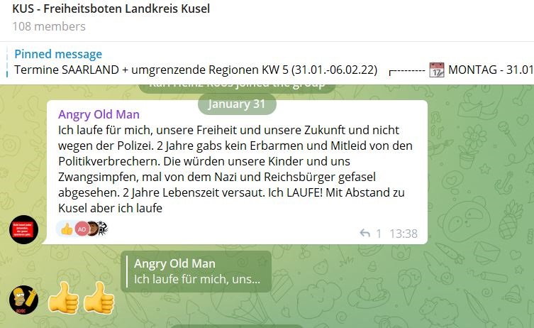Bei den „Freiheitboten Landkreis Kusel“ bekommt ein „Angry old man“ Zustimmung, der weiter „laufen“ will, weil „Politikverbrecher“ auch kein Erbarmen zeigen würden: „Mit Abstand zu Kusel aber ich laufe.“