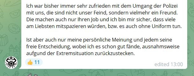 Hier zeigt sich auch ein Wandel des Polizei-Bildes innerhalb der Corona-inspirierten Demonstrationen. Im Corona-Startjahr 2020 sah die Pandemieleugner:innen-Szene Polizist:innen eher noch als Partner:innen an. Immer wieder wurden Aufrufe an die Polizei gestartet, „die Seiten“ zu wechseln und sich bei den Demonstrierenden einzureihen. Jede Geste des Zuspruchs – sei es eine freundliche Lautsprecherwagen-Durchsage oder ein Hände-Herz einer Polizistin am Rande der Demonstration – wurde begeistert durch die Social-Media-Blase getrieben und bestärkte das Gefühl der Demonstrierenden, nicht pandemie-leugnend, nicht rücksichtslos und unsolidarisch gegen den Schutz von Schwächeren zu demonstrieren, sondern als „Gute:r“ für Freiheitsrechte auf die Straße zu gehen.