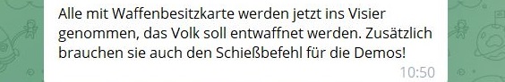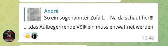 Ein anderer, „Thomas“, bekräftigt: „Das klingt nicht wirklich glaubwürdig und so arbeiten eher die Geheimdienste.“ Aber warum sollten Geheimdienste das tun? „Thomas“ vermutet: „Das muss anders heißen nicht Polizisten Mord sondern Terroristen Mord, Polizisten sind die ja keine (…).“ und er führt weiter unten aus: „da wird ein Riesenaufwand betriben, weil sie j auch zu den Verbrechern gehören, von den Impftoten (Totgespritzte) sagt keiner was.“ (Fehler im Original). Ein Autor namens „Corona Virus Informationen“ hat eine andere Idee: „Sicher ist aber das die Psychopathen alle Waffenbesitzer entwaffnen wollen, um alle wehrlos zu machen.“ Ein „André“ sekundiert: „… das aufbegehrende Völklein muss entwaffnet werden“. Ein anderer ergänzt: „Zusätzlich brauchen sie auch den Schießbefehl für die Demos.“ (Alle Fehler im Original).