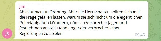 „Jim“ schreibt: „Aber die Herrschaften sollten sich mal die Frage gefallen lassen, warum sie sich nicht um die eigentlichen Polizeiaufgaben kümmern, nämlich Verbrecher jagen und festnehmen anstatt Handlanger der verbrecherischen Regierungen zu spielen“ (alle Fehler in allen Zitaten im Original).