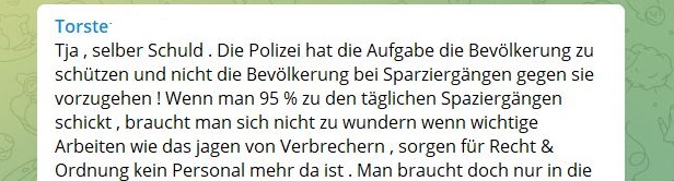 „Torsten“ ergänzt: „Tja, selber Schuld. Die Polizei hat die Aufgabe die Bevölkerung zu schützen und nicht die Bevölkerung bei Spaziergängen gegen sie vorzugehen!“