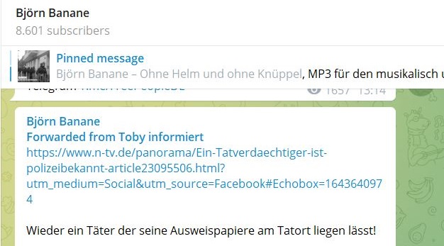 So teilt Querdenken-Sänger „Björn Banane“ die Aussage: „Wieder ein Täter der seine Ausweispapiere am Tatort liegen lässt“. Zweifelt dieser Beitrag, die Polizeiermittlungen an? Deutet er eine dahinterliegende Absicht an? Neonazi Sven Liebich wird deutlicher, sieht die „Rubrik zufälligste Zufälle“ walten.