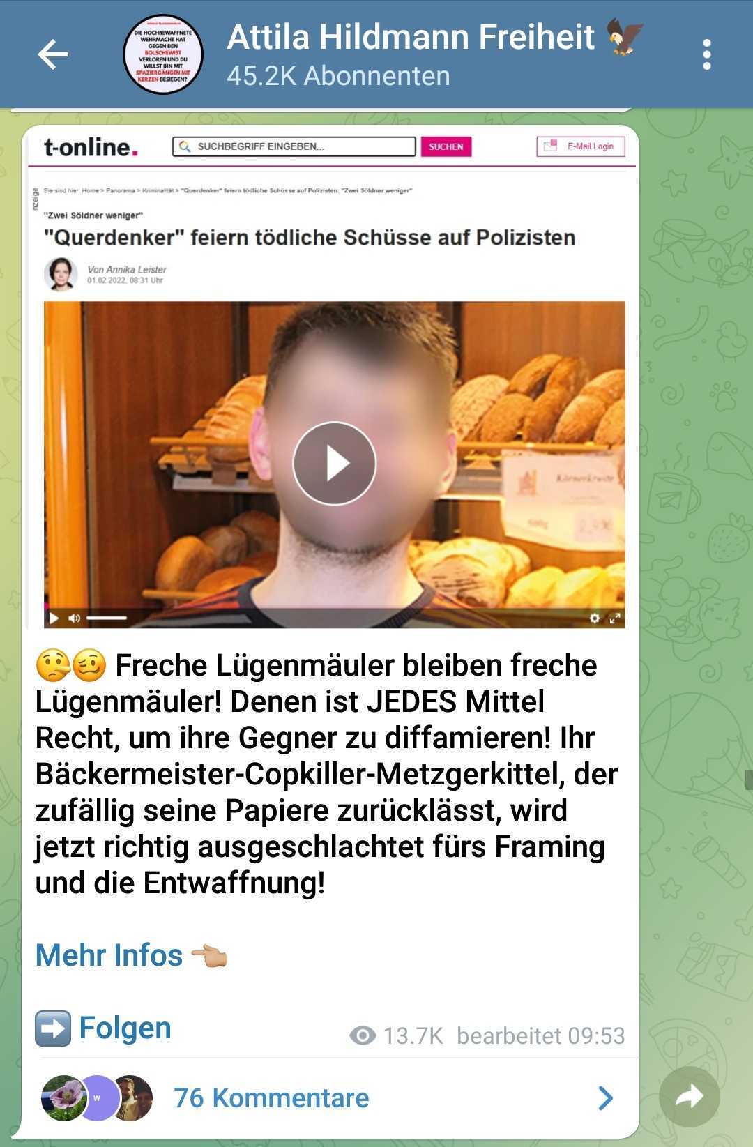 Auch Attila Hildmann sieht eine Verschwörung am Werk: „Denen ist JEDES Mittel Recht, um ihre Gegener zu diffamieren! Ihr Bäckermeister-Copkiller-Metzgerkittel, der zufällig seine Papiere zurücklässt, wird jetzt richtig ausgeschlachtet fürs Framing und die Entwaffnung.“
