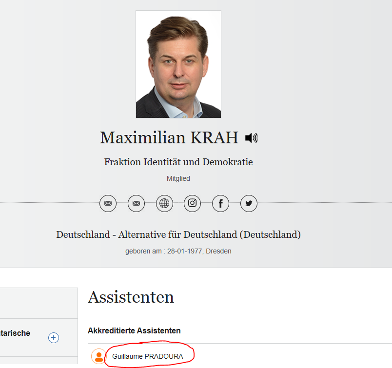 Damit hätte Pradouras politische Karriere beendet sein können. Stattdessen taucht Guillaume Pradoura nun aber als Mitarbeiter eines deutschen-EU-Abgeordneten der AfD auf der Europaparlaments-Website wieder auf: Er arbeitet nun im Büro des sächsischen Anwalts Maximilian Krah.