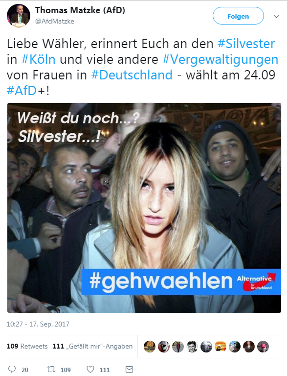 Ein besonders perfider Fall von Desinformation sorgte nur wenige Tage vor der Bundestagswahl bei Facebook und Twitter für Aufregung. Ein Bild zeigt eine blonde Frau mit zerzaustem Haar, hinter ihr eine Menschenmenge aus Männern mit dunkler Hautfarbe. Die Aufschrift “Weißt du noch…? Silvester…!” soll die Assoziation von sexualisierten Übergriffe in der Kölner Silvesternacht 2015/2016 wecken. Unten rechts auf dem Bild das AfD-Logo, daneben der Hashtag “#gehwaehlen”. Sowohl der AfD Kreisverband Regensburg als auch Thomas Matzke, Ex-AfD-Bundestagskandidat teilten das Bild. Letzterer mit folgendem Kommentar: