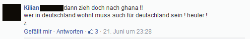 Bei „Schwarz-Rot-Geil“ hört der Spaß also auf. Das musste auch Hans Sarpei feststellen. Sarpei ist ein ehemaliger Nationalspieler Ghanas, lebt aber schon seit seiner frühesten Kindheit in Deutschland und ist durch seine ironischen Kommentare zu einem Liebling der deutschen Online-Welt geworden. Seine Facebook-Seite hat über 500.000 „Likes“, auf Twitter folgen ihm etwa eine viertel Millionen Menschen. Als er seine Freude über die ghanaischen Treffer gegen Deutschland kundtat, erzürnte dies einen Teil seiner deutschen Fangemeinde. Man witterte „Undankbarkeit“ und „Verrat“. Garniert wurde das ganze selbstverständlich mit rassistischen Schimpfwörtern. Es stellten sich aber auch einige Facebook-User*innen auf Sarpeis Seite: