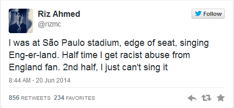 Der englische Schauspieler und Musiker Riz Ahmed, dessen Eltern aus Pakistan stammen, musste während des Spiels von England gegen Uruguay im Stadion die Erfahrung machen, dass für einige Engländer*innen seine Hautfarbe und Nationalität unvereinbar sind. So twitterte er aus São Paulo: