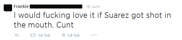Twitter-Nutzer*innen aus England zeigten ebenfalls, dass sie den Sieg von Uruguay über England, für den in erster Linie der Stürmer Luis Suarez verantwortlich zeichnete, schwer verkraften konnten. Statt der viel beschworenen „Völkerverständigung“ führte der Spielausgang zu Gewaltphantasien und Morddrohungen: