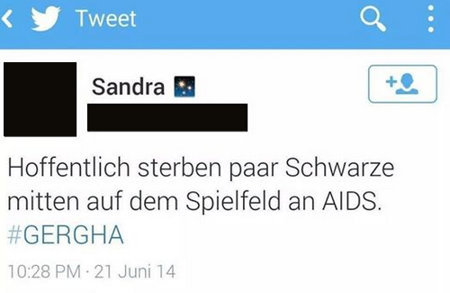 Den sozialen Medien, allen voran „Twitter“, kommt bei dieser WM eine wichtige Rolle zu. Sie ermöglichen es Rassist*innen, ihre Kommentare direkt und ungefiltert vom Stammhirn der Mehrheitsgesellschaft in den digitalen Raum zu blasen. So ist es dieses Jahr sehr viel einfacher möglich, den Nachweis zu führen, dass der mit der WM verbundene Nationalismus latent vorhandene rassistische Einstellungen während der Spiele manifest werden lässt. So taten sich auch während des Spiels der DFB-Vertretung gegen das ghanaische Team Abgründe von ungeahnten Ausmaßen auf. „Tweets“ in denen ghanaische Spieler mit dem „N-Wort“ bezeichnet wurden, gehörten noch zu den harmloseren Äußerungen (Link:Lichterkarussell) ]. Eine junge Kommentatorin wünschte sich gar: