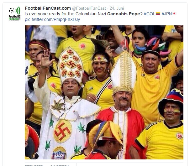 Bereits in der vergangenen Woche war beim Spiel Kolumbien gegen Japan der bisher skurrilste Fan der WM zu Gast, den wir noch nachtragen müssen: Ein Hakenkreuz-Cannabis-Papst stand im kolumbianischen Gästeblog, wie FootballFanCast berichtete. Über seine Intention ist nichts bekannt, doch man kann es mit dem Kommentar des amerikanischen Portals „Sportgrid.com“ halten: „Und übrigens, einen extra päpstlichen Segen für die brasilianische Security, die diesen Mann ins Stadion gelassen hat. Großartiger Job! Viel Mühe gegeben!“ Wir sind gespannt, ob der heute noch einmal zum Spiel kommt.
