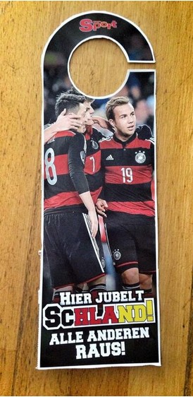 In nationale Ekstase versetzte der deutsche Sieg auch einige ihrer Anhänger in Aschaffenburg. Die Insassen eines Fahrzeugs beim Autokorso in der Innenstadt waren in ihrem Stolz derart bestärkt, dass die simple schwarz-rot-goldene Beflaggung nicht mehr ausreichte. Stattdessen hielten sie während der Fahrt eine überdimensionierte schwarz-weiß-rote Fahne aus dem Fenster. Fast noch erstaunlicher als dieser Vorfall ist die Tatsache, dass dieses Foto unter www.main-netz.de noch mehrere Tage nach dem Spiel ganz unkritisch als Teil einer Sammlung an Party-Fotos zu finden war.