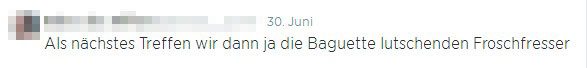Auch das gewonnene Viertelfinalspiel Deutschlands gegen Frankreich bot am Wochenende wieder Anlass zu nationalistischen Ausfällen quer durch die Republik. In Aschaffenburg wurde nach dem knappen Erfolg das Weiterkommen von einem Anwesenden mit dem Hitlergruß gefeiert, mehrere Personen fielen außerdem durch „Sieg Heil“-Rufe negativ auf. In Saarbrücken wurde zum Autokorso direkt mal ein Militärfahrzeug beflaggt, anders kann man den Sieg gegen diesen historischen Gegner wohl auch nicht angemessen feiern.