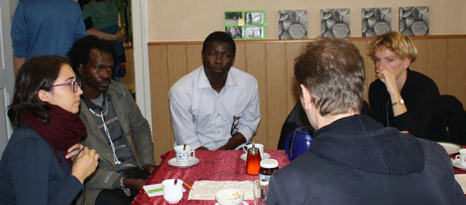 Schlimmer noch trifft die Flüchtlinge allerdings der Rassismus der Mehrheitsgesellschaft, der ihnen alltäglich entgegenschlägt. „Wenn wir das Heim hier in Güstrow verlassen, zeigen uns die Menschen auf der Straße den Mittelfinger, sie schreien und rempeln uns an“, erzählt Abdoulaye aus Mauretanien. Wie oft passiert das? „Jeden Tag. Immer.“ Er sagt, er reagiert dann nicht. „Ich lächle und versuche, freundlich zu sein, aber die Integration ist sehr schwierig. Nur wenn ich im Heim bleibe, habe ich keine Probleme.“ Sherif, ebenfalls aus Mauretanien, ergänzt: „Sie zeigen mit dem Finger auf uns. Neulich kam mir einer entgegen und brüllte mir ‚Ebola, Ebola“ ins Gesicht.“ Der junge Schweißer ist kein Mann großer Worte, er muss sie suchen. Er guckt auf seine Hände und sagt: „Wenn ich in einen Laden gehe und etwas kaufe, will die Verkäuferin nicht einmal das Geld anfassen, dass ich zuvor in der Hand hatte.“ Wie kann man das aushalten? Noch dazu, ohne etwas zu tun zu haben? Abdullah, der in Mauretanien Geologe war und sich jetzt Deutsch aus einem Buch beibringt, weil er noch nicht für einen Sprachkurs zugelassen wurde, sagt: „Ab und zu gibt es eine Disko. Es heißt zwar, in der Disko gibt es hier keine Entspannung, sondern nur Ärger, aber ich bin erst drei Monate hier, ich versuche es trotzdem.“ Außerdem dürfen die Flüchtlinge zwei Mal in der Woche den Fußballplatz nutzen, davon erzählen alle begeistert. Der Kontakt in örtliche Sportvereine lief dagegen nicht so prickelnd. Oft hören die Flüchtlinge, der Verein sei voll. Ein Freund von Eri aus Ghana wollte in den Boxverein. Dort wurde er im ersten Training gebissen. Seitdem geht dort niemand mehr hin.