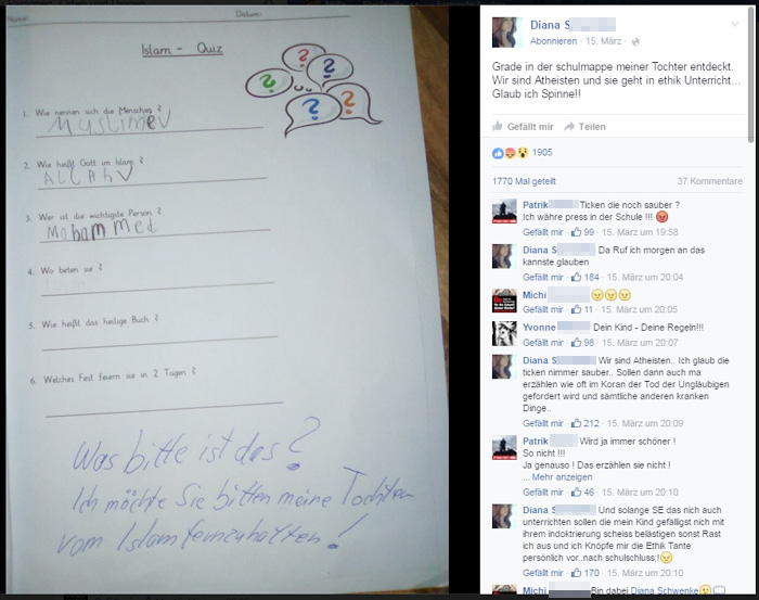 Auch die inzwischen (Stand: 17.03. 2016, 11.30 Uhr) 1.770 Menschen, die den Post von Diana S. geteilt haben, die 1.895 Facebook-Profile, die ihn geliket haben, keinen der 37 hochempörten Kommentatoren scheint zu interessieren, dass Wissensvermittlung über Religionen zum ganz normalen Unterrichtsstoff des Ethik-Unterrichts in der Schule gehört. Kurze Nachhilfe: Die drei abrahamitischen Religionen Judentum, Christentum und Islam werden ab der Grundschule im Ethikunterricht behandelt. Aber klar: Die wollen Unterricht ÜBER den Islam mit Erziehung ZUM Islam verwechseln. Worüber könnte schlechtmensch sich sonst noch aufregen?