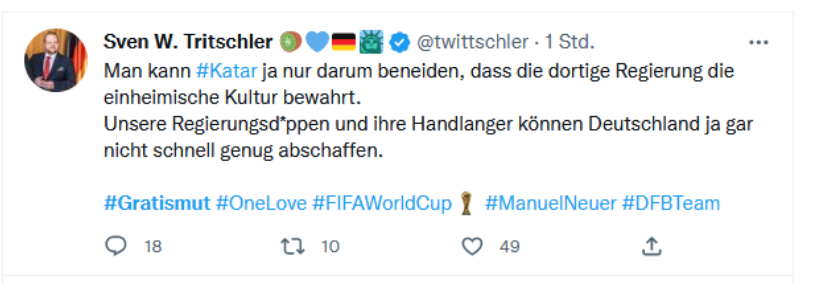 Besonders niveaulos kombiniert Birgit Kelle auf der „Achse des Guten“ die Themen „Gratismut“, Rassismus und Sexismus: „Dem Haufen an Fußballmillionären, den man früher unter dem Namen ‚Deutsche #Nationalmannschaft’ kannte, ist gerade der eigene Gratismut auf die Füße gefallen. #FußballWM #katar #woke.“ Name ihres Artikels: „Keine Eier in Katar“. Ah ja.