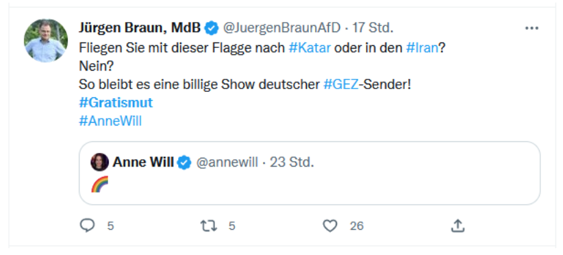 Das nehmen auch AfD-Bundestagsmitglieder gern auf – etwa Nicole Höchst, die ja geschlechtlicher Vielfalt bekanntermaßen den Kampf erklärt hat. Trotzdem schreibt sie auf Twitter: „Nennt sich Gratismut. Mein Respekt gegenüber gratismutigen Posern in egal welchem Bereich ist nun bei unter Null. Haltung beweist man tatsächlich nur gegen (großen) Widerstand und nicht indem man in einem angenehmen, zuträglichen Milieu eine Welle am seichten Sandstrand macht.“ Das ist als Hasstirade gegen die Fußballwelt zu verstehen – nicht als Plädoyer für eine vielfältigere Gesellschaft.
