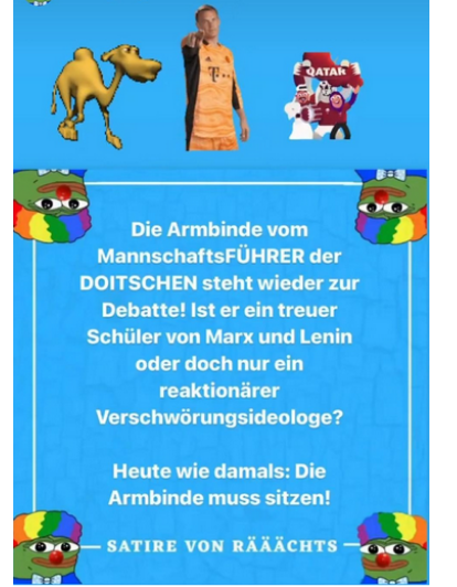 - Die Zustimmung gibt es auch kombiniert mit Bewunderung für die Standhaftigkeit gegen Menschenrechte, die Katar demonstriert: „Globohomo-Versager wieder mal #besigt [sic] von Wüstenchads“ schreibt auf Instagram ein rechtsextremer Imageboard-Fan, der sowohl seinen homofeindlichen Slang („Globohomo“ ist eine Anspielung auf eine queere Agenda, die die Welt homosexuell machen möchte) als auch seinen Manosphere-Sprech beherrscht („Chad“ als Ausdruck für einen starken, bewunderswerten „Alpha”-Mann).