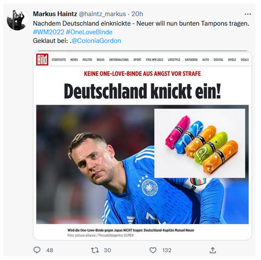 Nehmen wir etwa den rechtsalternativen Publizisten Boris Reitschuster, der auf Twitter schreibt: „Das peinliche Einknicken von Neuer & Co. vor Fifa und den Scheichs.“ Möchte Reitschuster also in Zukunft mehr Regenbogen-Flaggen bei allen Fußballspielen? Eher nicht. Was er möchte, offenbart der nächste Satz: „Wenigstens zu einem ist die WM gut: Wie sonst hätte der feige Gratismut unserer Moral-Lautsprecher derart brutal entlarvt werden können wie durch das Affentheater um „One-Love“?“ Es geht also nicht um die Gleichberechtigung geschlechtlicher Vielfalt – es geht darum, um progressive Werte bemühte Menschen als Heuchler*innen darzustellen. Diesen Narrativen haben die FIFA und der DFB mit ihren Lippenbekenntnissen zur Vielfalt, die bei der Androhung von gelben Karten nicht mehr durchgehalten werden, leider viel Wasser auf die Mühlen gegeben.