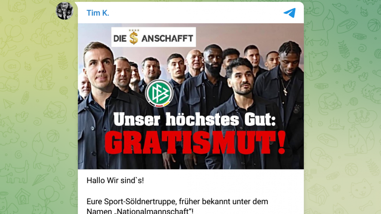 Da ist sie schon fast bei Deutschlands Hass-Influencer Timm Kellner angekommen, der auf Telegram poltert: „Eure Sport-Söldnertruppe, früher bekannt unter dem Namen „Nationalmannschaft“! Dieser Name war uns jedoch zu nationalistisch, rückwärtsgewandt und konservativ. Heute stehen wir tapfer für Moderne, Weltoffenheit und Toleranz. Aus der sicheren Entfernung haben wir mit unserem Gratismut heldenhaft für die bunte Binde gekämpft.“