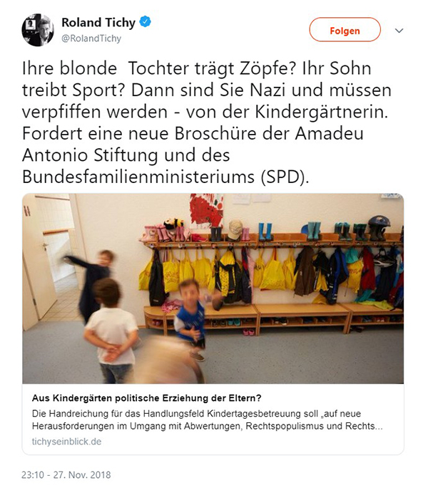 19.10.2018, rechtsextremer Blog „Philosophia Perennis“, Autor David Berger: „Kitas: Drohende Kinderdressur durch Broschüre der Amadeu Antonio Stiftung“20.10.2018, rechtspopulistischer Blog „Journalistenwatch“: „Amadeu Antonio Stiftung vergreift sich an Kinderseelen“20.10.2018, rechtsextremer Blog „Halle-Leaks“, Autor Sven Liebig: „Der lange Arm der Stasi: Kahane-Stiftung will Kinder in Kitas dressieren“.