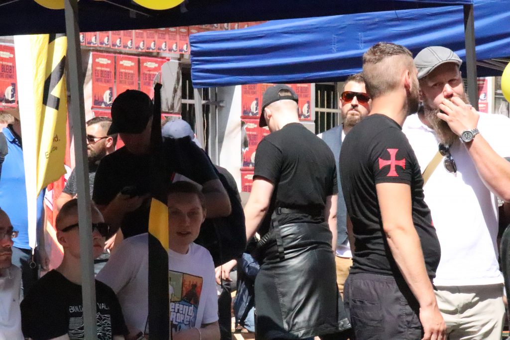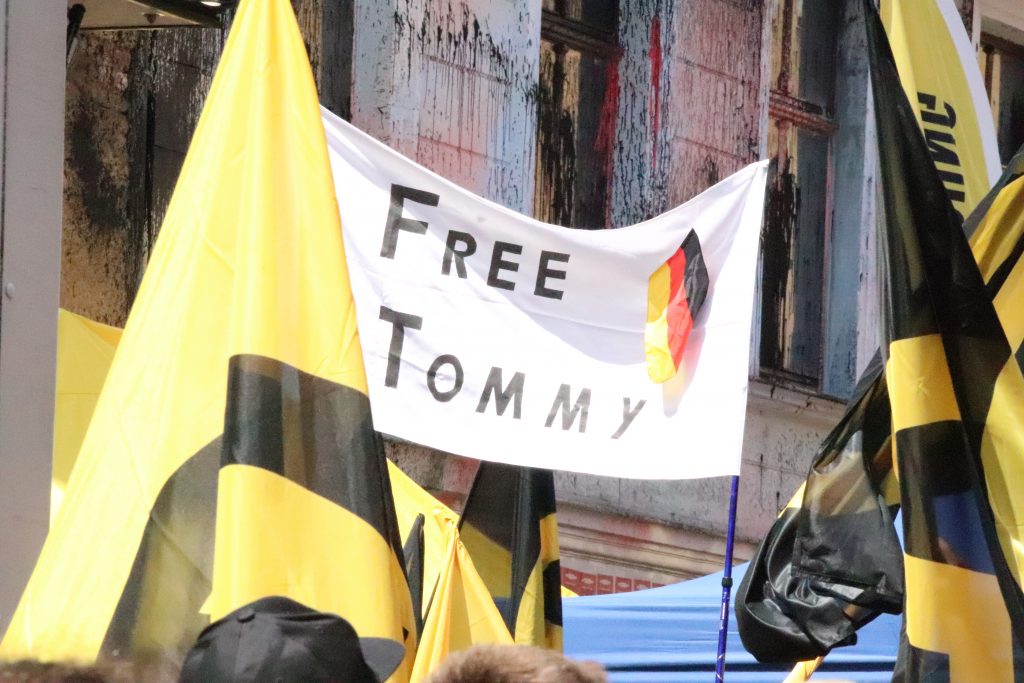 Sympathisanten des britischen Neonazis Tommy Robinson (bürgerlich: Stephen Yaxley-Lennon) zeigten „Free Tommy“-Flaggen. Robinson sitzt gerade im Gefängnis (Strafe: 19 Wochen), weil er von einem Gerichtsprozess wegen Kindesmissbrach mit Nachrichtensperre einen Livestream auf Facebook machte, um noch schneller rassistische Ressentiments zu verbreiten. Die Flaggen lagen wohl noch vor: Zuletzt war Robinson 2017 zu einer 18-monatigen Haftsprache verurteilt worden wegen unrechtmäßiger Berichterstattung von einem Vergewaltigungsprozesses: