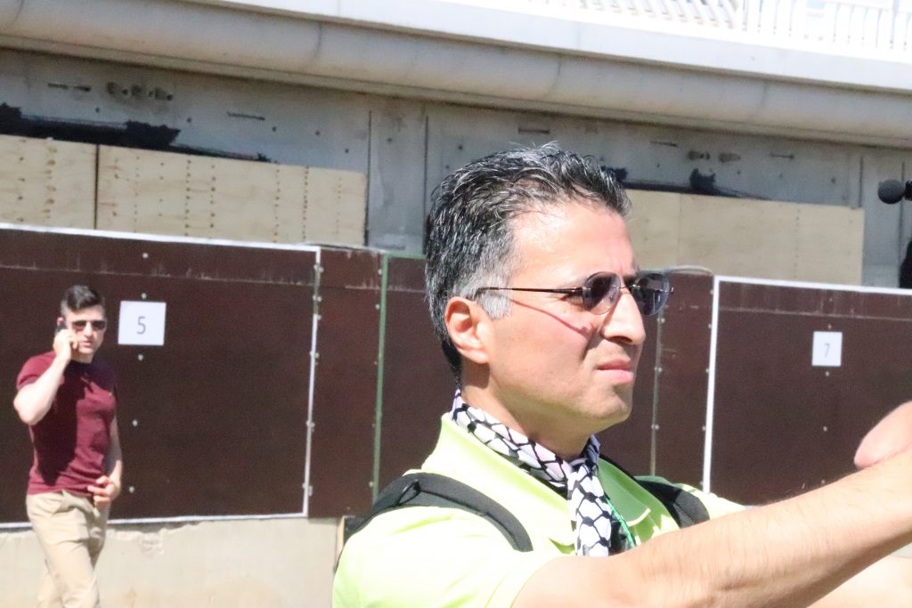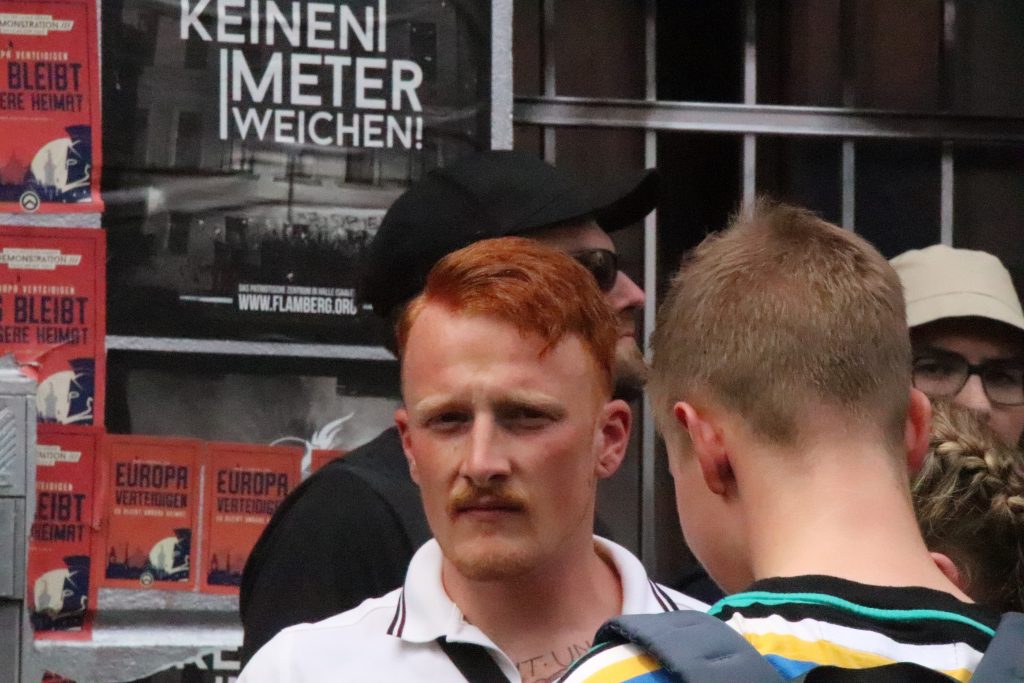 Auch der bekannte Holocaustleugner Reza Begi war in Halle. Auch dort schrie er mehrmals „Der Holocaust ist eine Lüge“. (Im Hintergrund: Martin Sellner)