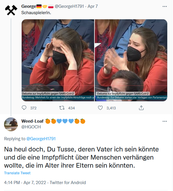 Der Junge Alternative-Aktivist Nils Hartwig verlautbart auf Twitter: „Fakt ist-Ohne ein Mosaik aus einem Parlamentarischen Widerstand, vertreten und angeführt durch die AfD, Bürgerbewegungen in ganz Deutschland, Spaziergängern und unermüdlichen Internet-Aktivisten hätte es heute eine Mehrheit zur Impfpflicht gegeben. Danke!“ (sic!)