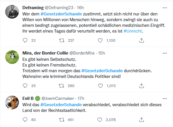 #GesetzderSchande ist einer von mehreren Hashtags, die von der Impfgegner:innen-Bewegung in die Twitter-Trends gepusht wurden. Es ist naheliegend, dass die Bewegung vor der Abstimmung und der Demonstration noch einmal sämtliche Social Media-Reserven aufgebracht hat, um gesellschaftlichen Druck aufzubauen. Der Begriff der „Schande“ stigmatisiert ein Gesetz, das lediglich den Schutz von vulnerablen Menschen vor einem tödlichen Virus garantieren soll, als moralisch verwerflich, als etwas, für das sich Befürworter:innen gefälligst zu schämen haben.