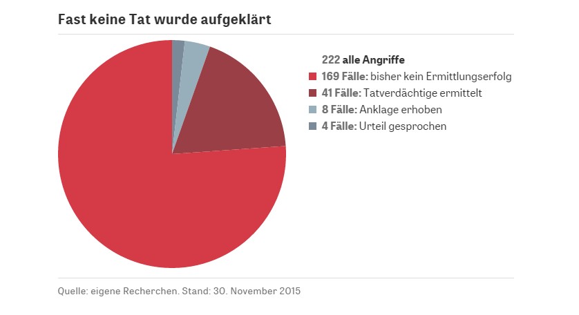 Ein Rechercheteam von ZEIT ONLINE und DIE ZEIT ist 222 gewalttätigen Angriffen auf Flüchtlingsunterkünfte in diesem Jahr nachgegangen. Es sind alle Attacken, bei denen Menschen zu Schaden gekommen sind oder zu Schaden hätten kommen können. Das Ergebnis: Nur in vier Fällen haben Gerichte bisher Täter verurteilt, in weiteren acht Fällen wurde Anklage erhoben. Das sind gerade einmal fünf Prozent aller Angriffe. In weniger als einem Viertel aller Fälle konnte die Polizei überhaupt einen Tatverdächtigen ermitteln. Fast alle Taten sind also bis heute nicht aufgeklärt. Elf Prozent der Verfahren wurden mittlerweile sogar ganz eingestellt. Und dass, obwohl schon 104 Menschen bei Übergriffen verletzt wurden.