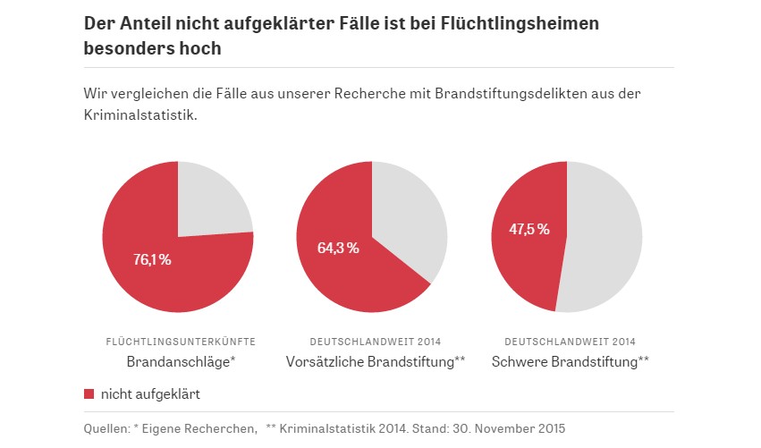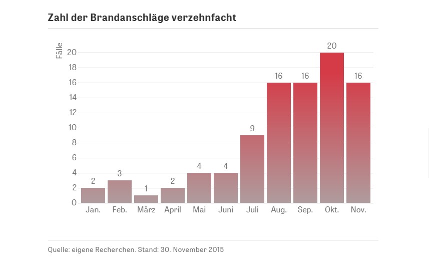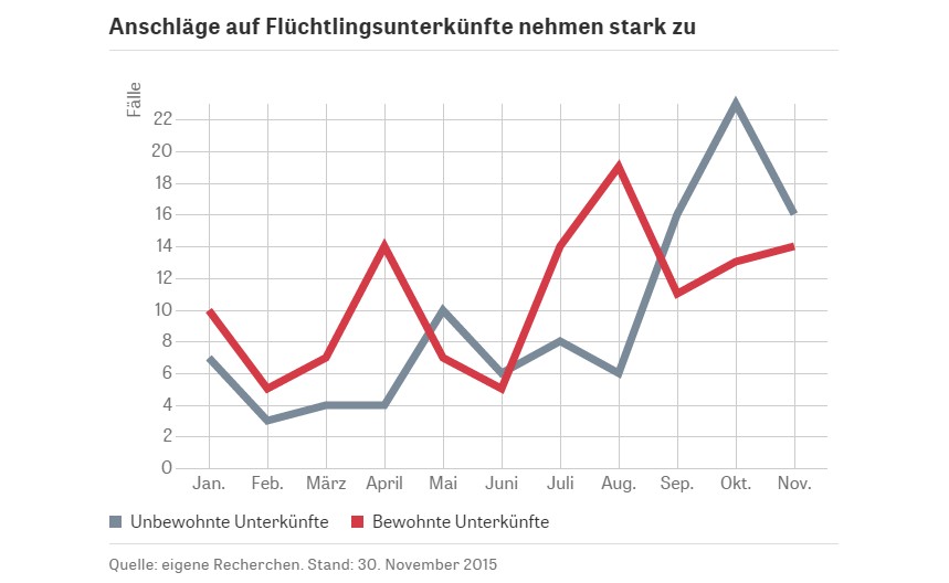 Ein Rechercheteam ist acht Wochen lang 222 Angriffen auf Flüchtlingsunterkünfte nachgegangen, die in diesem Jahr registriert wurden. Ausgewertet wurden die bundesweiten Daten von Angriffen, deren Ziel es war, Flüchtlingsunterkünfte zu beschädigen oder zu zerstören und/oder die darin lebenden Menschen zu verletzen oder zu töten. Rassistische Schmierereien an den Hauswänden wurden nicht mitgezählt, ebenso wenig fremdenfeindliche Hetze von Demonstranten vor Asylbewerberheimen. Um in der Statistik erfasst zu werden, mussten mindestens Steine geflogen sein.
